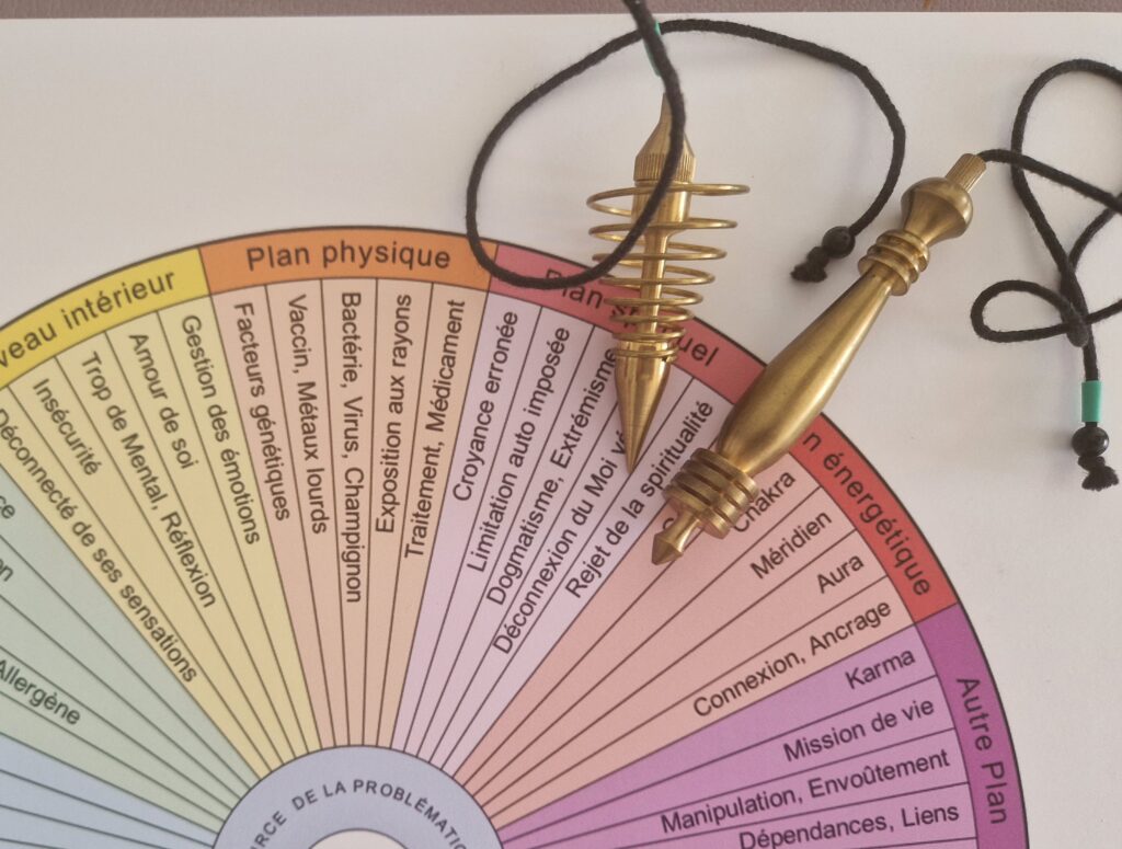Lors des séances, je m’appuie aussi sur des planches de radiesthésie : ce sont des supports visuels qui rassemblent des informations précises (émotions, causes de blocage, chakras, organes, pistes d’action…). Le pendule, en se déplaçant au-dessus de ces planches, oriente la lecture en pointant ce qui est pertinent à l’instant T.